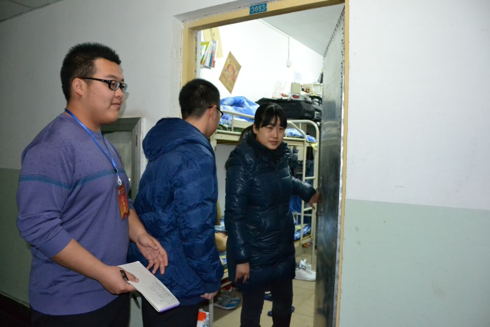 2014年12月10日晚,澳门沙金在线平台党委副书记刘光老师,团委书记王宇鹏老师,学生科科长张丽花老师,学生科段雪倩老师、李晓彧老师、杨博炜老师、祁亚芳老师带领生活部人员对学生宿舍进行了检查,各宿舍情况良好,查寝结果也令人满意,特此通报。
