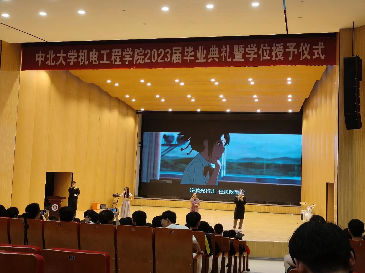 老师和同学们的致辞后,是精彩的节目表演。毕业班主任刘凯琼老师和张悦老师与三位毕业生携手演唱《起风了》,处处毕业情,声声难舍离。