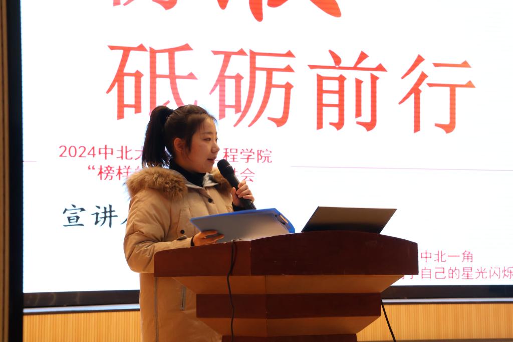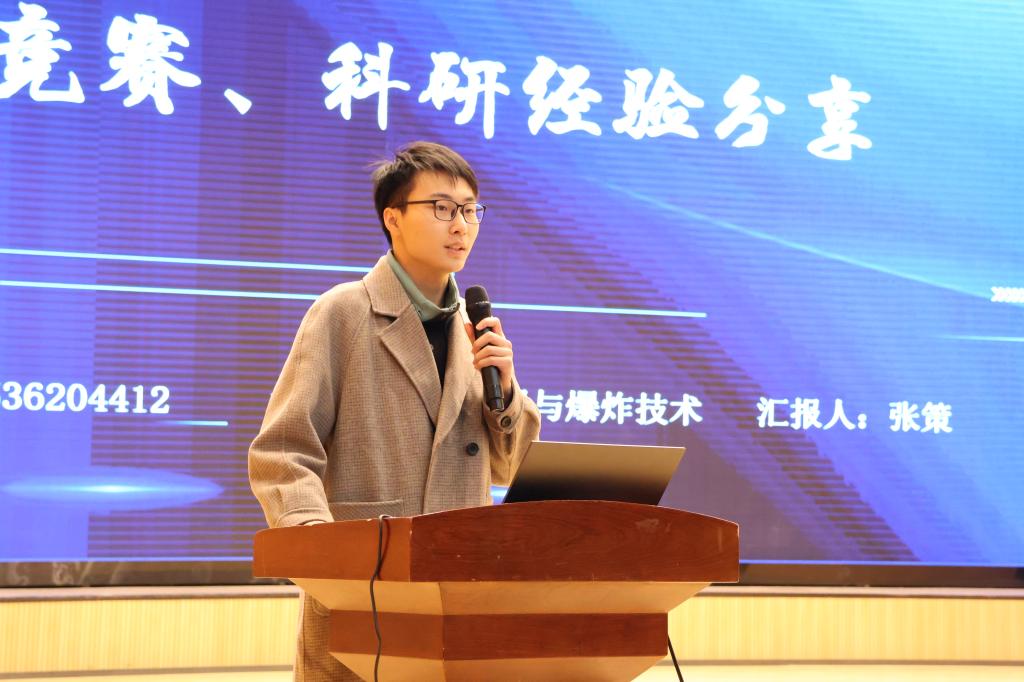 张策就科技竞赛相关赛事、赛程及准备工作做了详细介绍,鼓励同学们多参加科技竞赛以开拓眼界、拓宽知识面;李富健讲述了自己大学3年入伍5年的不平凡生活,更是在退伍后认识到自己的基础较差,进而刻苦学习,更是一学期通过16门课程的事迹;郭旭尧热心志愿服务,传递爱心,鼓励更多的同学能够加入到志愿服务中来;李胜阳介绍了自己所在的2077宿舍全体成员如何互助共帮,在学习、科技竞赛等多领域共同学习、共同进步,最后全员成功保研的事迹;国家奖学金获得者王欣悦,在思想上追求进步,学习上创造卓越,做到了有明确的规划和保证坚定的执行力,为同学们分享了成功背后的经历;张婧,推免至中国科学技术大学直博,她分享了自己的推免之路,她在夏令营中的脱颖而出、面试中顺利通过,展现了中北机电学子的风采,为同学们推免研究生提供了重要参考。